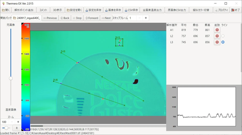 - 全画素の温度データ、濃度データをCSV形式で保存できます。